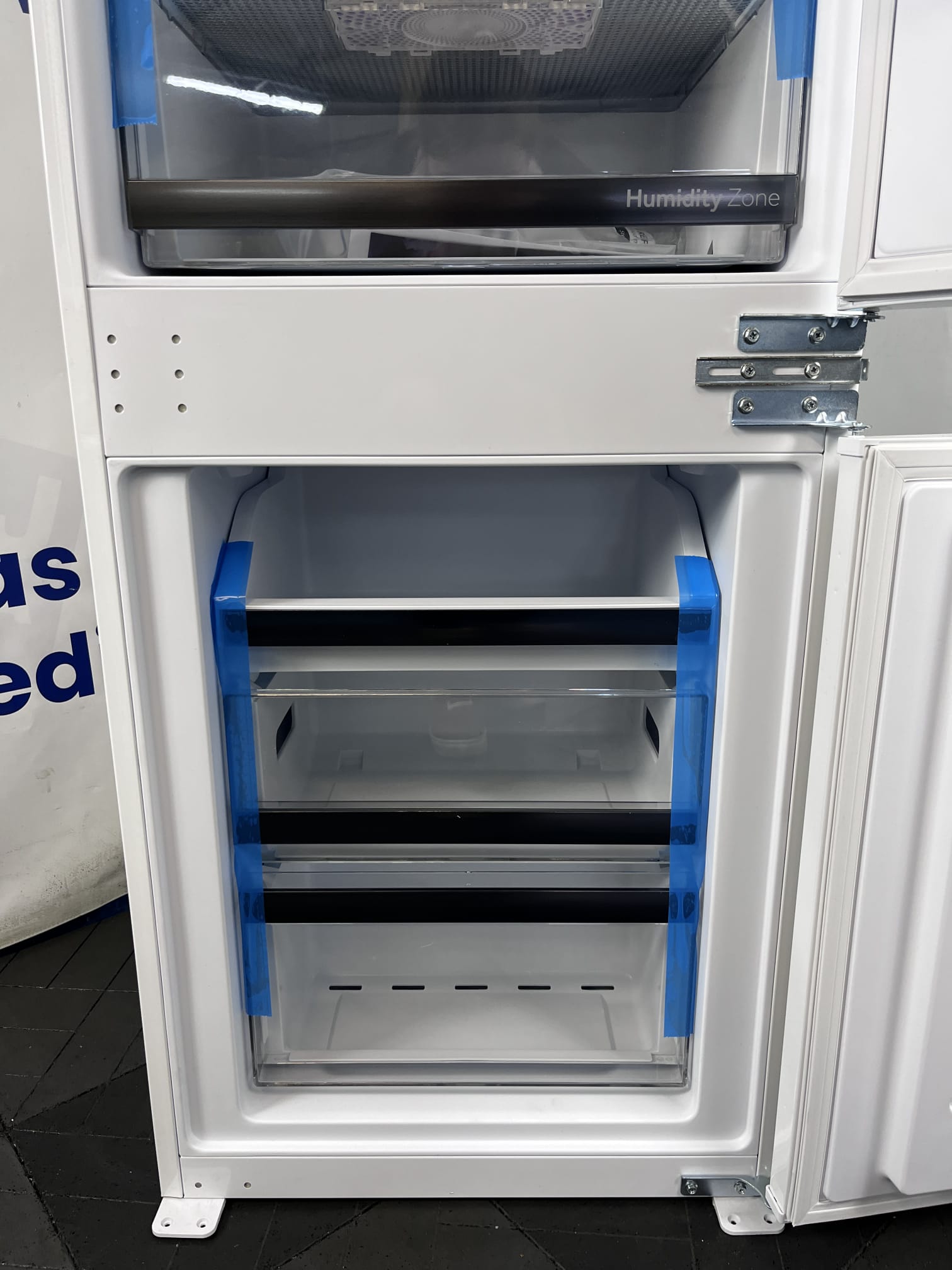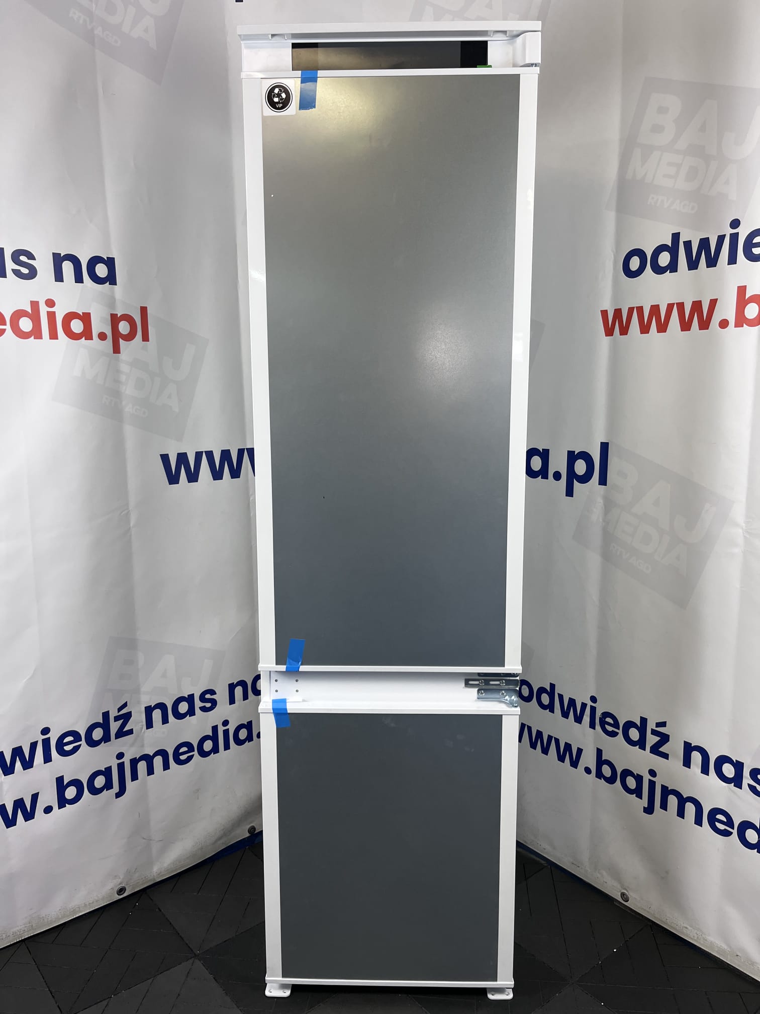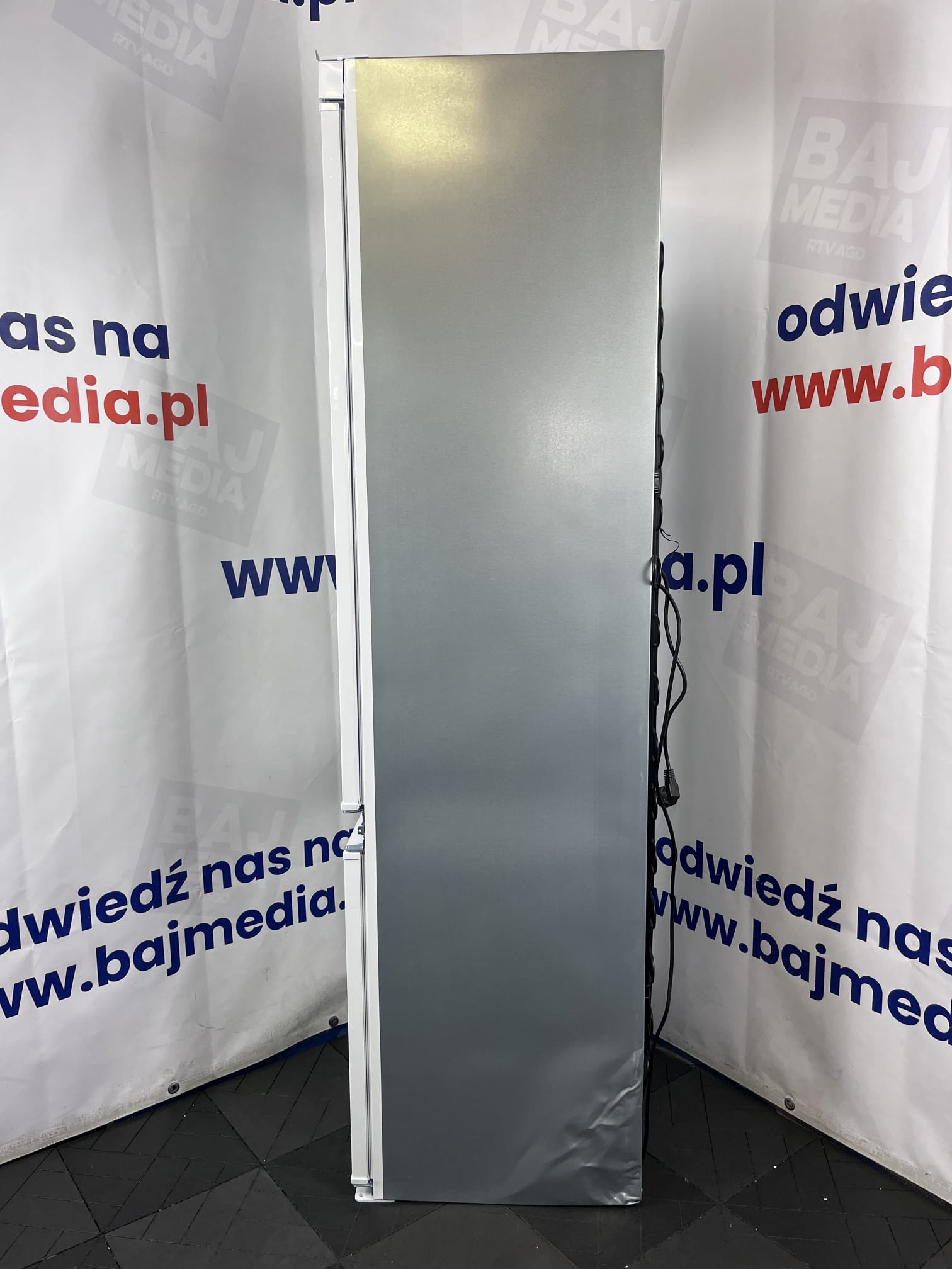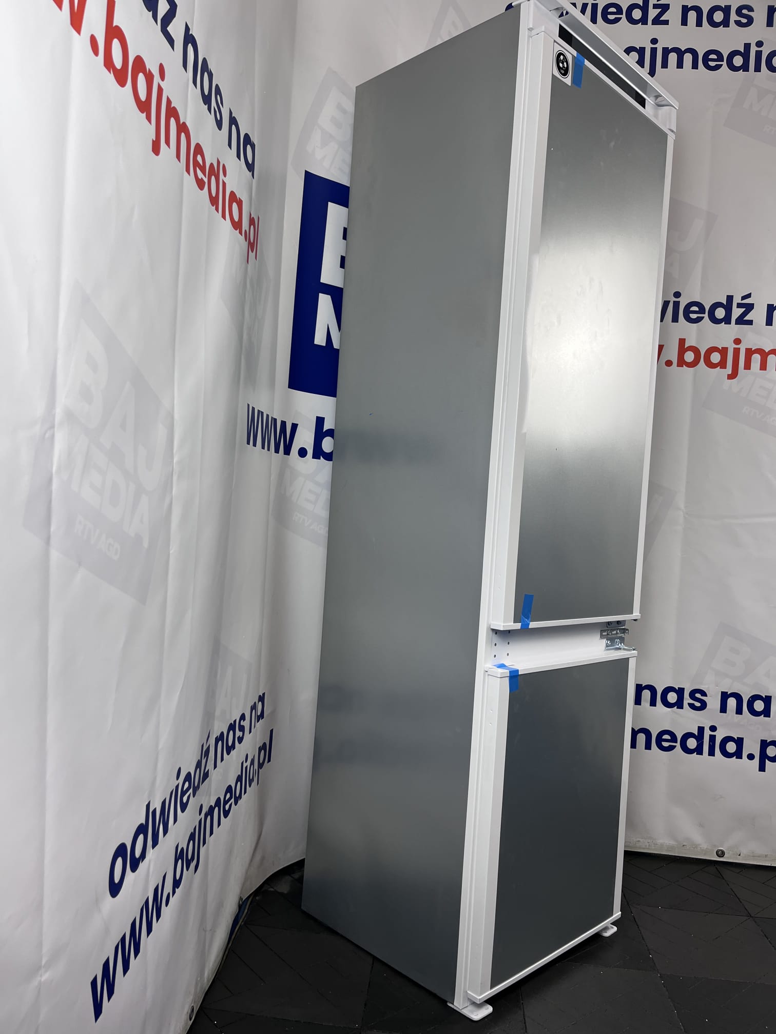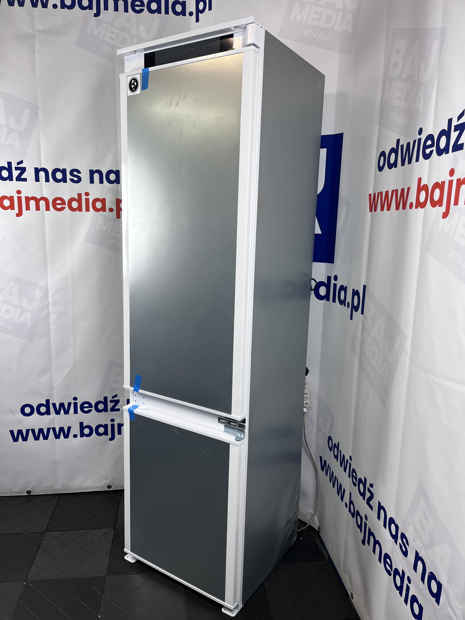 Lodówka posiada standardowy system montażu frontów (nożycowy lub na prowadnicach, zależnie od specyfikacji sztuki), który zapewnia stabilność i estetyczny wygląd po całkowitym ukryciu urządzenia.